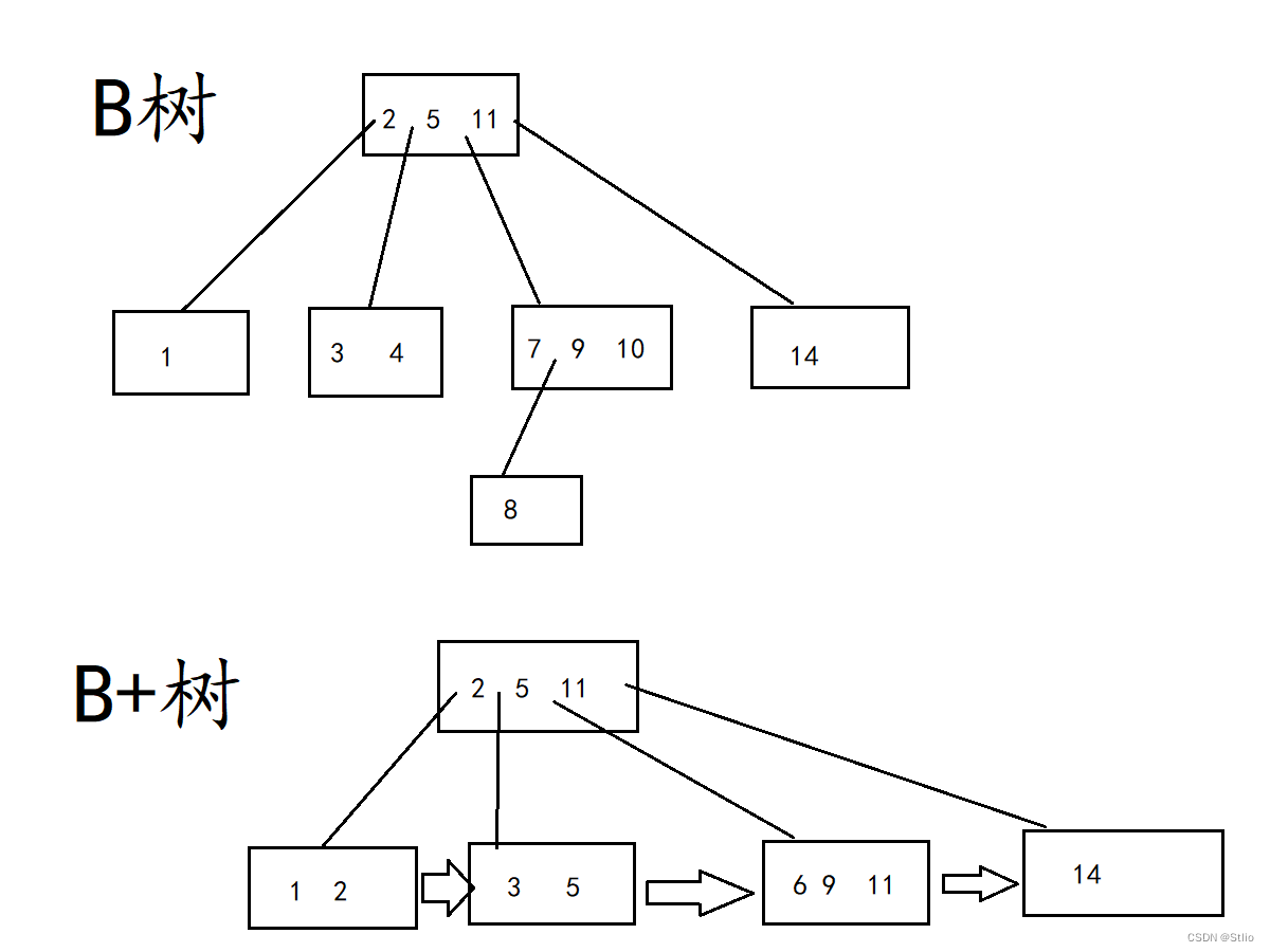 • 所有实际数据只存在叶子节点,且叶子节点之间用链表连接(形成有序链表)。