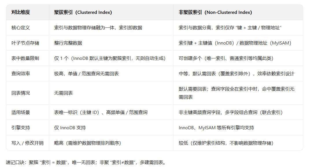 • InnoDB 中主键索引是聚簇索引(叶子节点直接存储整行数据),无需回表,查询效率最高。