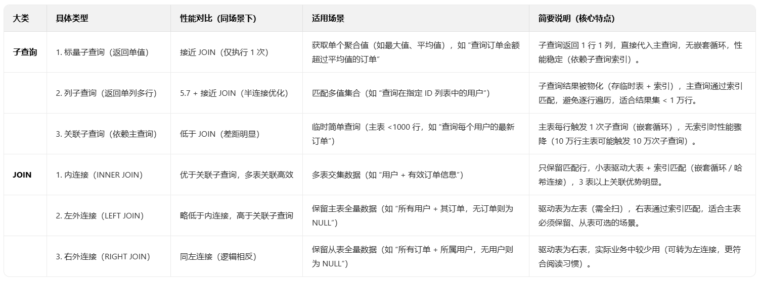 - 简单场景(如单值匹配、存在性校验)用子查询(写法简洁);