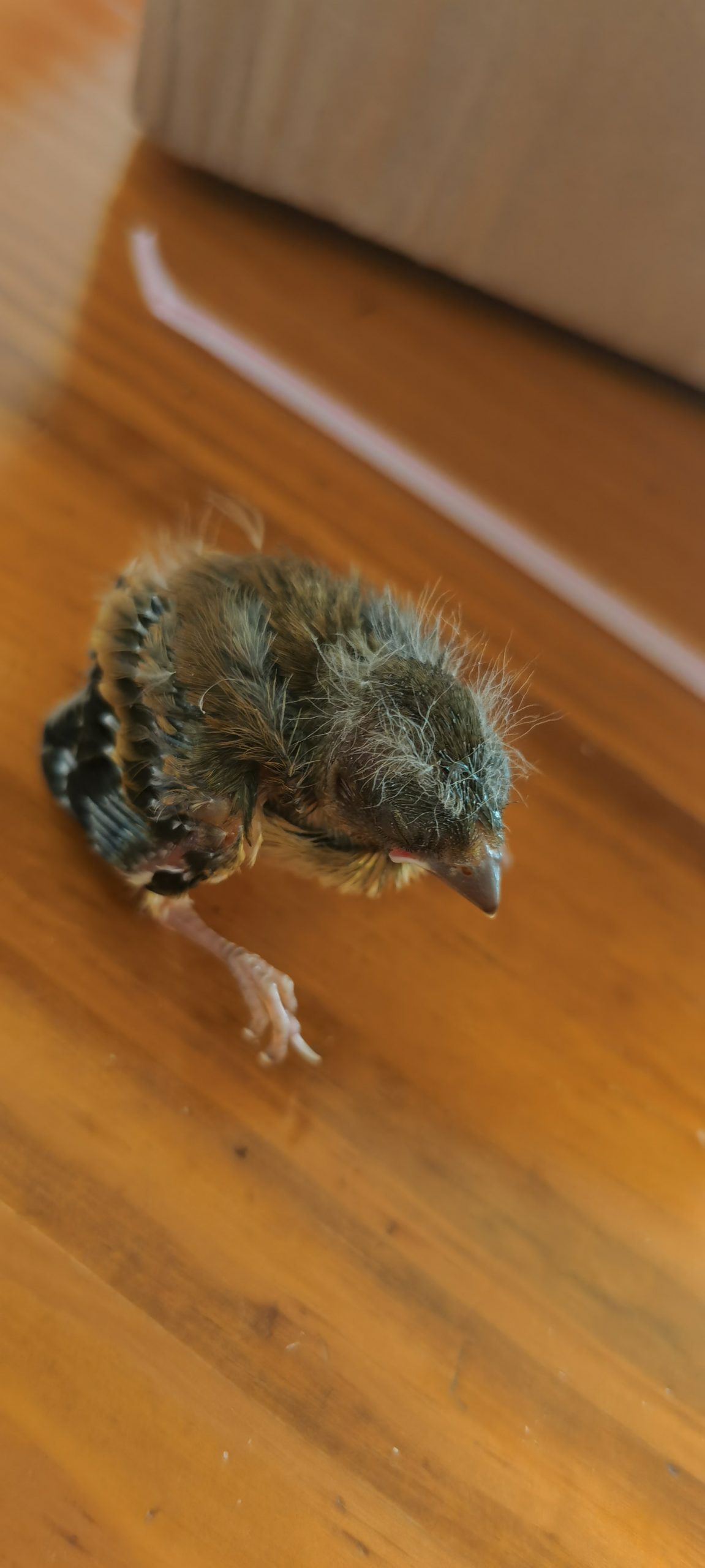 感觉像是麻雀幼鸟,旁边已经有好几只死掉的正在被蚂蚁吃,这个幼鸟太小了而且状态非常萎靡,再加上中午太阳特别晒,感觉它也很快撑不住了,我就带走了。