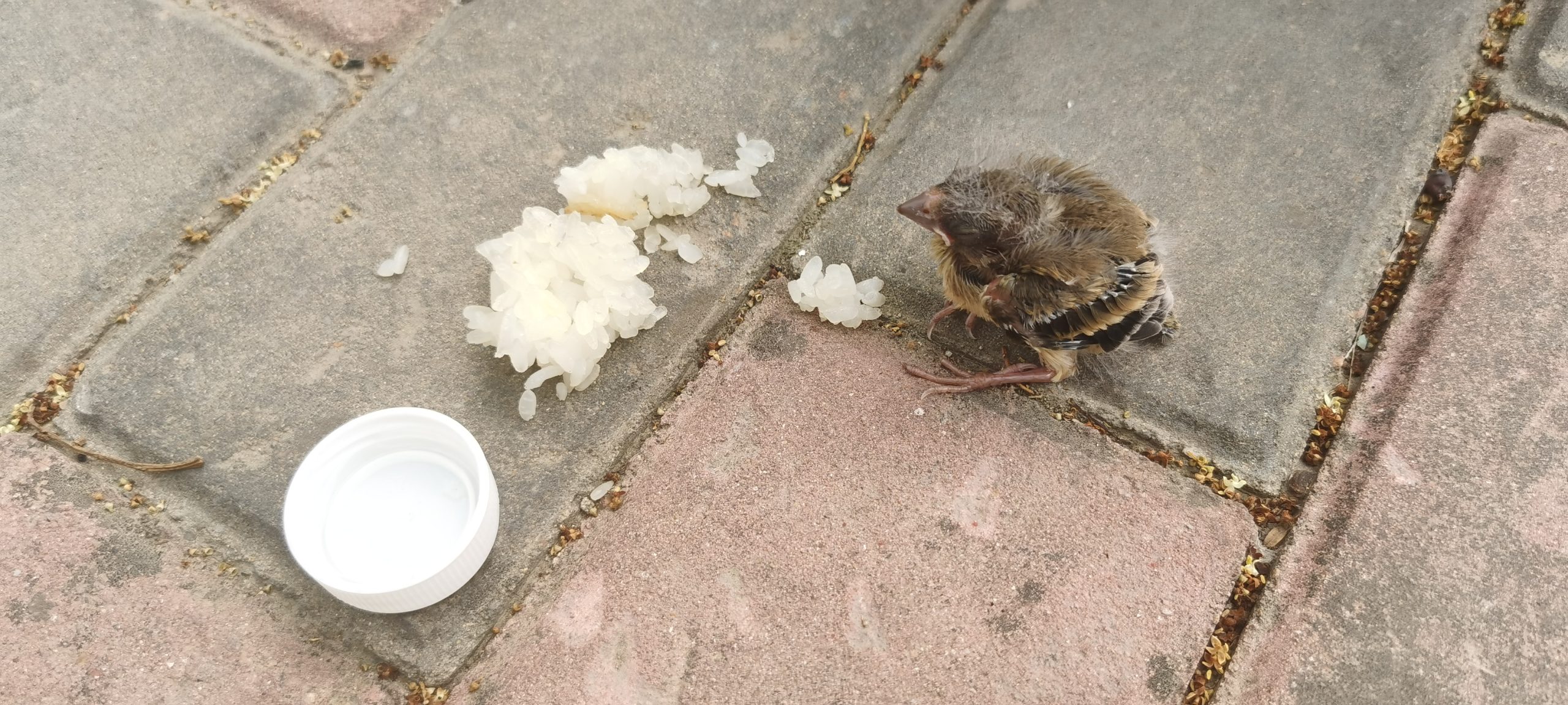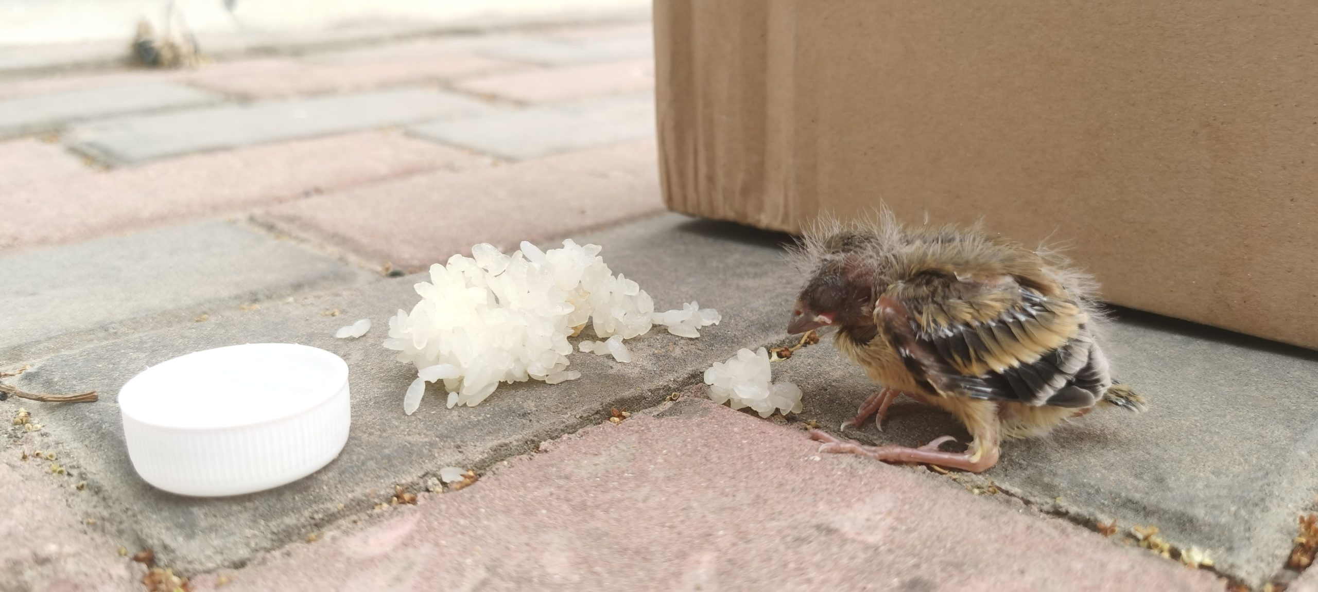 由于它还无法自行觅食和喝水,也不会飞行,而我也没有养鸟经验,就只能经过一番折腾后才成功的喂了一粒熟米粒和一些纯净水。